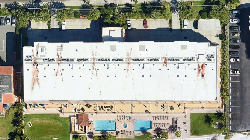 An infrared thermography and moisture detection study was conducted across approximately 30,000 square feet of roof on a multi-story condominium building in Redington Beach, FL. The building utilized a PVC membrane roof system designed to prevent water intrusion into underlying insulation. GeoView was tasked with determining the presence and location of moisture beneath this membrane due to suspected compromises in the roof’s integrity.