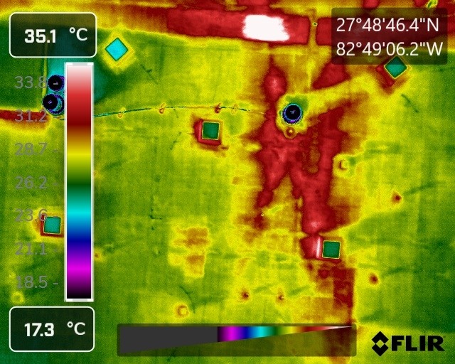 There was a strong correlation between the moisture meter data and the infrared results, which supported the finding that failed seams were the primary source of water intrusion. Notably, no moisture was detected in a recently repaired southeast corner of the roof, validating the effectiveness of those specific repairs. All identified areas of concern were marked on-site with spray paint and documented on scaled site maps to guide future remediation efforts.