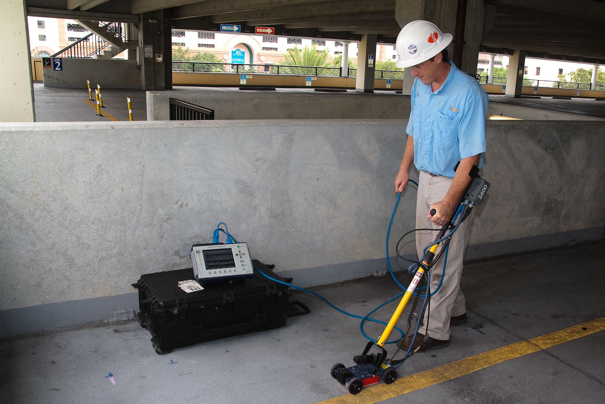 The GPR survey was conducted on ten floors. The GPR data showed the rebar was located in an orthogonal grid, with the rebar spaced 4 to 12 inches apart. The post tension cables were located between support columns. The centers of the proposed safe coring locations were marked on the surface of the concrete. As a result of the GPR survey, no rebar or post tensioning cables were cut during the coring activity.