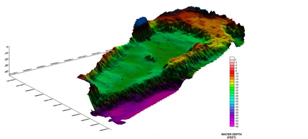 GeoView, Inc. conducted a bathymetric study within the western portion of pond at a limestone mine in Marion County, Florida. As part of a roadway expansion project, the western portion of the pond was to be infilled. The purpose of the study was to map the water depth in order calculate slope analysis and fill volume. Due to site access, a portable pontoon boat had to be used for the survey.
