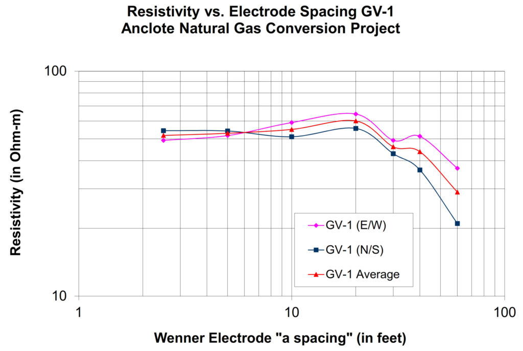 The four-pin resistivity testing was conducted using the Super Mini-Res, manufactured by L&R Instruments, Inc. The in-situ values of ground electrical resistivity were determined using a Wenner array with “a spacings” of 2.5, 5, 10, 20, 30, 40 and 60 ft. Two orthogonally-oriented vertical electrical soundings (VES) were collected around a center point. Comparison of the VES results indicate that readings for the larger “a spacings” were affected by some unknown source of interference. In addition, smaller “a spacing” values were observed that were not typical for the site area. Accordingly, the entire VES was considered suspect. A second set of soundings was performed immediately north of the plant and results were determined to be an accurate representation of site conditions.