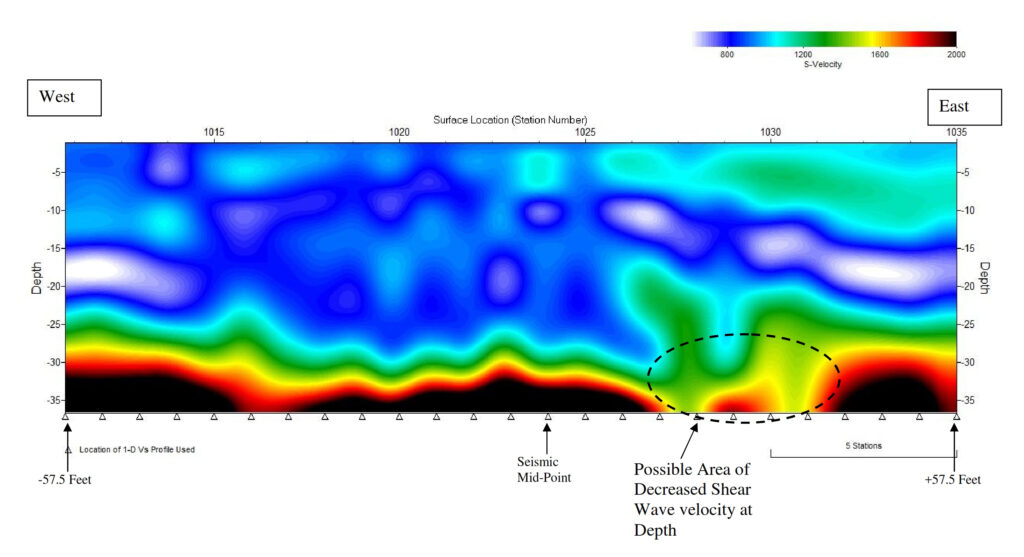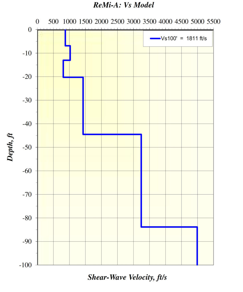 With the ReMi results it was possible to calculate a well-resolved shear wave velocity profile to a depth 100 ft below land surface. The results show significant increases in shear wave velocity at depths of 20, 44 and 83 ft.