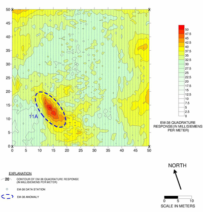 Each site is was approximately 2400 square meters in size. The sites were mostly grass covered with scattered trees and light underbrush. The EM-38 portion of the geophysical investigation was conducted using a Geonics EM38-MK2 (EM-38). The EM method responds to the presence of metals that are both iron-bearing (ferrous) and non-ferrous (e.g., aluminum or brass). For this study EM-38 measurements were taken using a vertical dipole orientation. This orientation provided bulk conductivity and inphase readings for soils to an approximate depth of 1.5 meters below land surface. The magnetics survey was conducted using a Geometrics 859 Cesium Vapor magnetometer. For the anticipated size of the targets, the anticipated depth range of sensitivity was 2 to over 5 meters, depending on target size and orientation. In addition to the frequency domain electromagnetics and total field magnetics, a traditional hand held metal detector was used at each survey area. The purpose of the hand held metal detector was to help identify small, shallow metallic objects that might get missed by the EM-38 and G-859 due to their greater depth of investigation and broader sensing area.