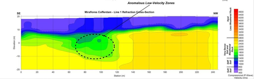 Seismic Refraction involves measuring the travel time of a body wave as it travels through an upper medium and along an interface of an underlying faster medium and then back to the surface. A hammer or explosive is used to generate the seismic wave. As the wave propagates through the subsurface and reaches an underlying, higher velocity stratum, the wave is critically refracted along that interface. A series of geophones is used to record the travel time of the direct and refracted waves as they reach the ground surface. In accordance with Snell’s Law, seismic refraction will be able to image deeper layers only if they have a higher velocity than the overlying layer. The maximum depth limits are typically 100 to 200 feet seismic refraction is commonly used for: