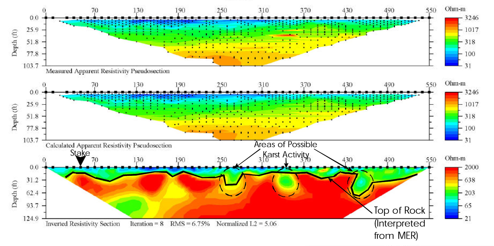 A total of 2,300 ft of Seismic Refraction data and 4,900 ft of ERI data were collected at the site. There was an excellent correlation between the seismic determined depth to top of limestone bedrock and the depth to limestone bedrock determined from several confirmation borings performed along the geophysical transect lines. Typically, the seismic derived depths correlated the boring determined depths within 2 to 3 ft. Several suspected karst features were identified on both the seismic data and the multi electrode resistivity data. The higher resolution of the ERI method allowed for the identification of smaller karst-related features that woudl have otherwise been missed if only a seismic study had been performed.