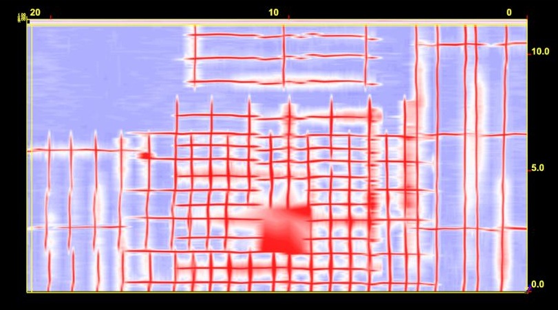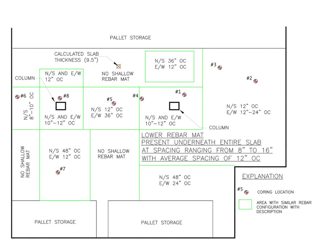 The areas around the column had an upper mat design of rebar on 10 to 12 inch centers. Outside of these areas the upper mat rebar pattern was highly variable; ranging from no rebar, to rebar in a single direction to rebar in a mat configuration with different spacing’s. Approximate boundaries of the areas with a similar upper mat rebar configuration were provided on a scaled site map.
