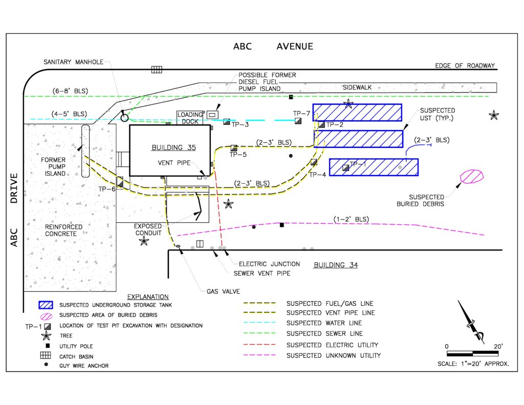 The former fuel pump island, associated fuel lines, and other utilities of interest were also identified during the geophysical survey. The locations of the underground storage tanks and utilities were confirmed with a series of test pits. The results were presented in an AutoCAD site map and marked on the ground surface with marking paint and wooden survey stakes.
