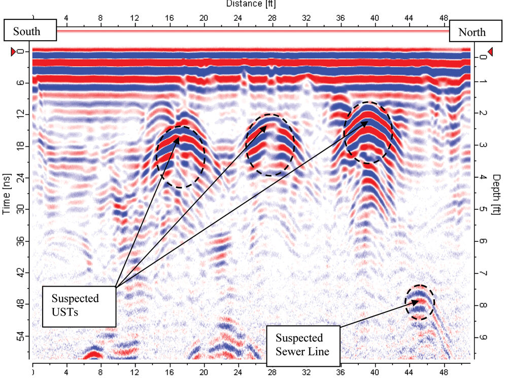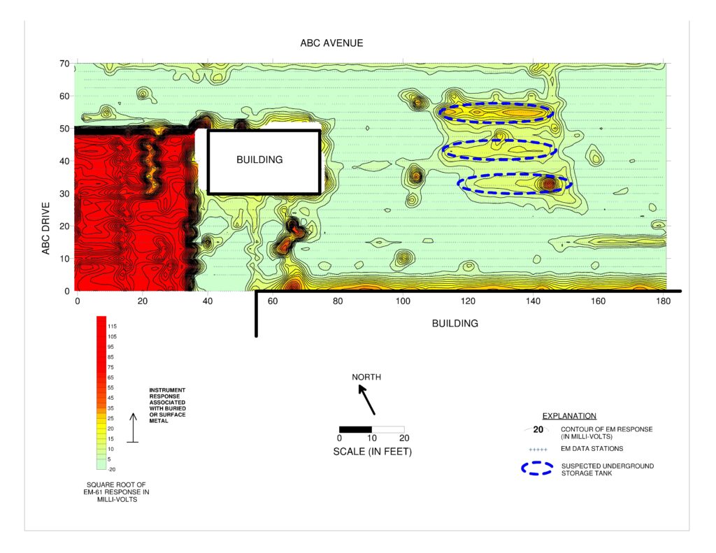 The geophysical investigation identified three previously unknown underground storage tanks within the survey area. The three tanks were each approximately 30 feet in length and at a depth of 3 feet.