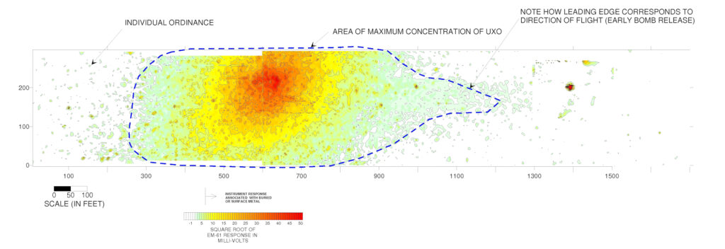 The apparent center of the bombing range was clearly identified as a “bulls-eye” on the contour map of the geophysical data. A seven foot by seven foot test pit performed within the suspected center of the bulls-eye identified over 100 pieces of ordinance within the test pit. Within areas of lower concentration of ordinance, outside of the bulls-eye, the location of each individual ordinance was identified and marked with a survey flag. Upon completion of the removal of the identified ordinance, a second geophysical investigation was conducted to verify that all of the ordinance had been removed from the project site.