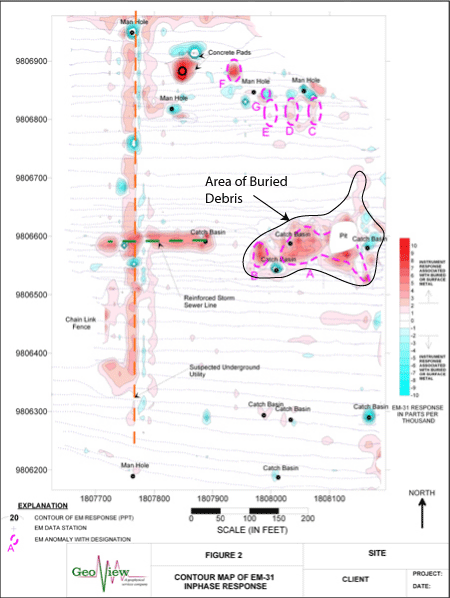 anomalies revealed that the two large anomalies were areas of buried debris.