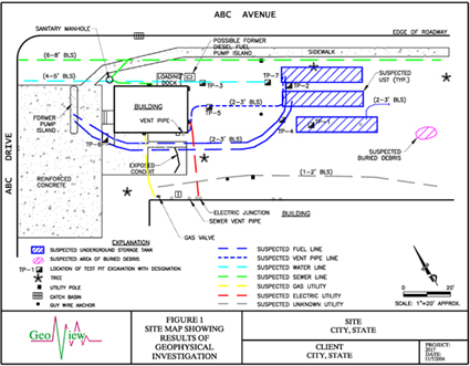 Three previously unknown underground storage tanks were discovered during the investigation. The tanks are evident on both the GPR transects (Figure 1) and the EM-61 contour map (Figure 2). The three tanks were each approximately 30 feet in length. The former fuel pump island, associated fuel lines, and other utilities of interest were also identified during the geophysical survey. The locations of the underground storage tanks and utilities were confirmed with a series of test pits. A site map (Figure 3) prepared in AutoCAD shows the results of the survey.