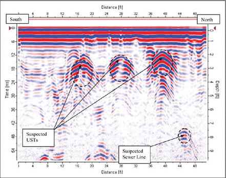 Figure 1 - GPR transect showing 3 underground storage tanks