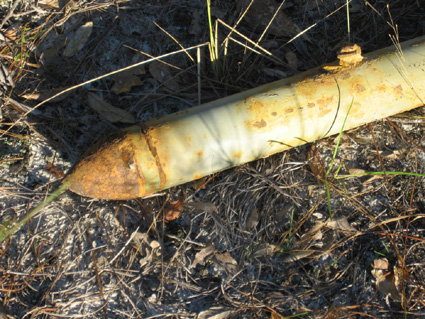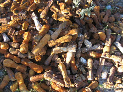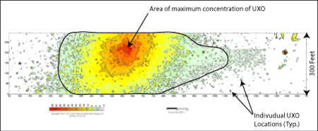 The apparent center of the bombing range was clearly identified as a "bulls-eye" on the contour map of the geophysical data. A seven foot by seven foot test pit performed within the suspected center of the bulls-eye identified over 100 pieces of ordinance within the test pit. Within areas of lower concentration of ordinance, outside of the bulls-eye, the location of each individual ordinance was identified and marked with a survey flag. Upon completion of the removal of the identified ordinance, a second geophysical investigation will be conducted to verify that all of the ordinance has been removed from the project site.