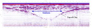 Ground Penetrating Radar is the most flexible, accurate and cost effective of the geophysical methods. The exploration depth of the method is controlled by the electrical conductance of the near-surface earth materials and selected frequency antenna. Sinkhole related investigations are typically conducted with either a 250 or 100 MHz antenna.